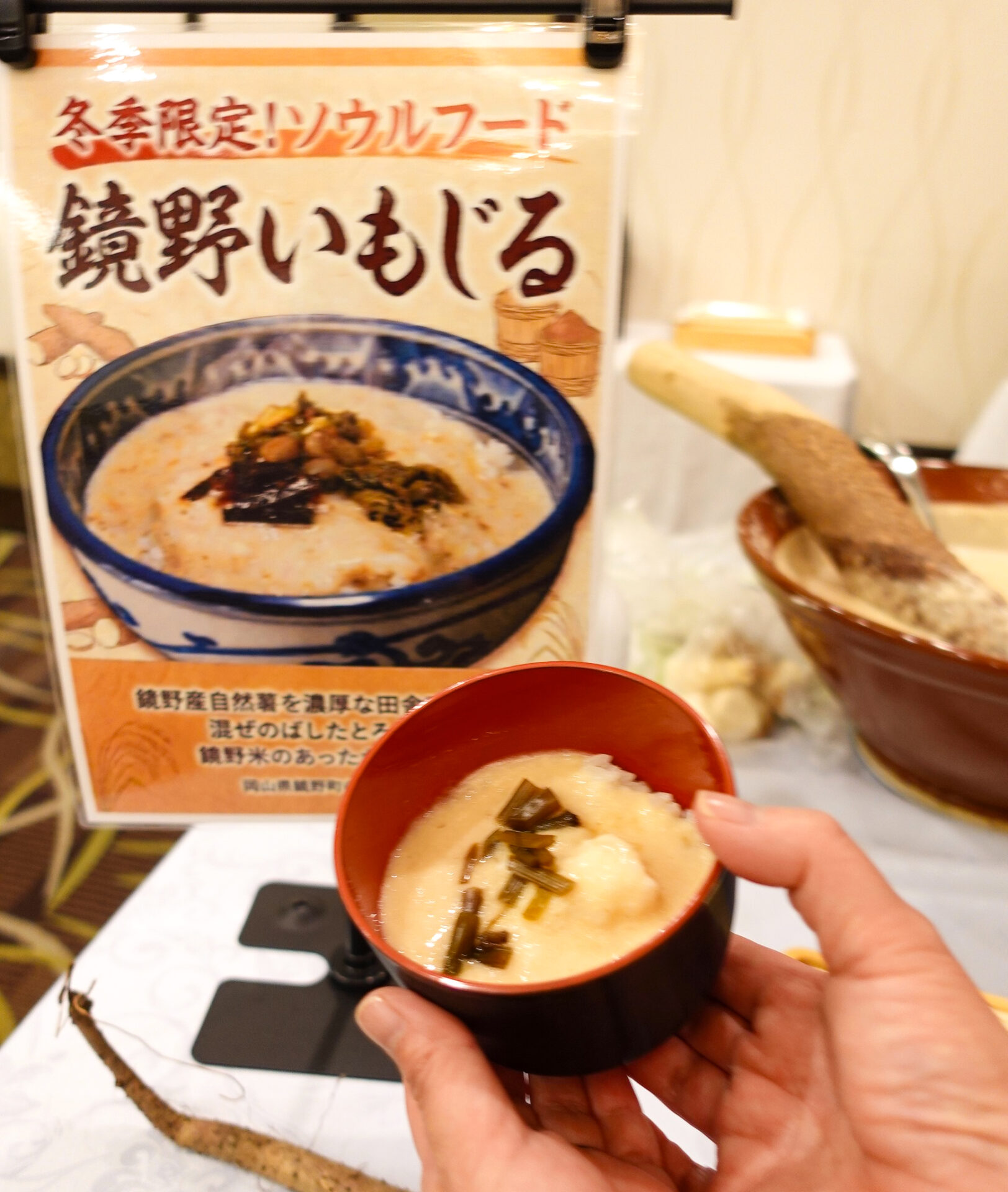 同町の特産の自然薯をすり、コクのある鏡野みその濃厚な味噌汁で混ぜのばしたとろろを、鏡野米のアツアツごはんにかけていただきます。