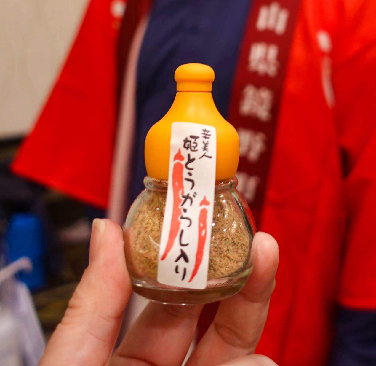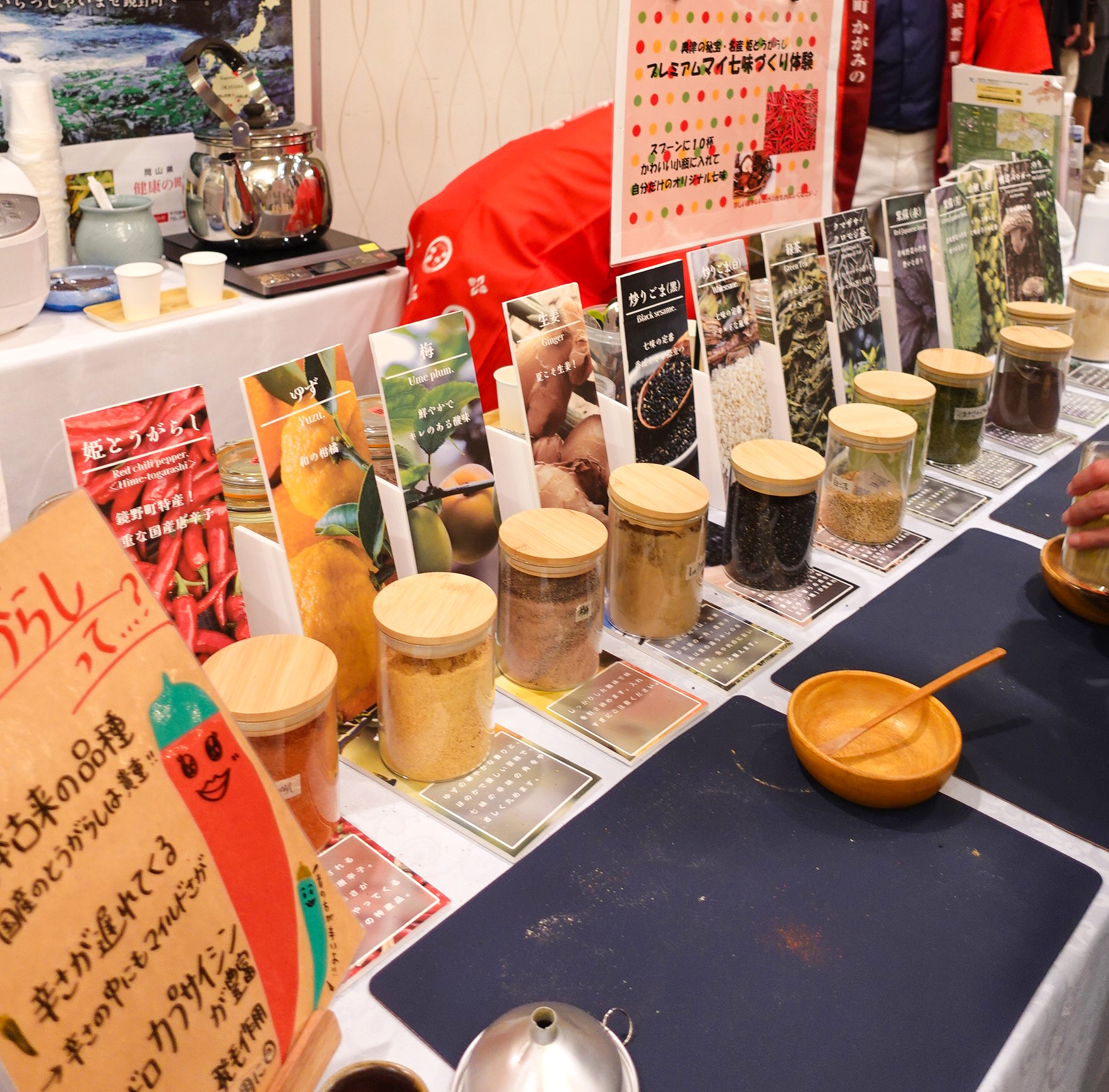 鏡野町のブースでは、特産の姫とうがらしを使った、オリジナルの七味つくりを楽しみました❗