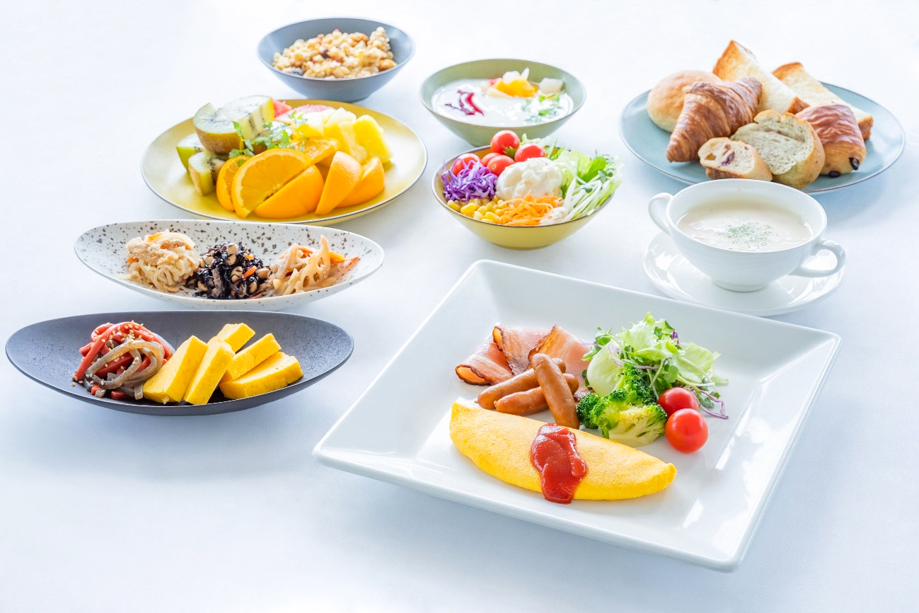 シェフが目の前で仕上げるオムレツをはじめ、地元食材を使った和総菜など、一日の元気をもらえそうな和洋メニューがならびます。