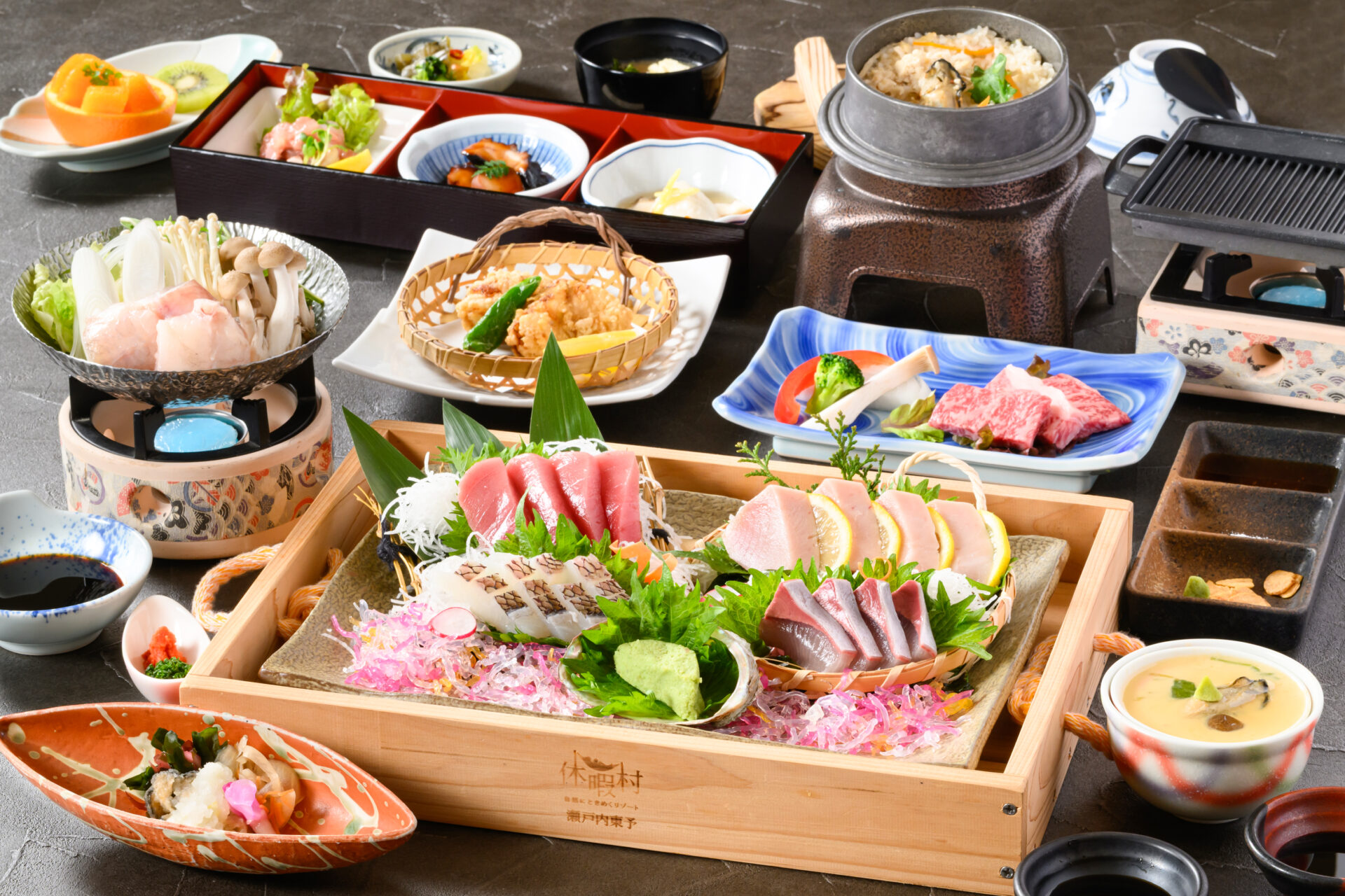 | 夕食 | 瀬戸内海や宇和海の新鮮な魚、国産牛ステーキ、水の都・西条の野菜や果物を、地元出身の料理長が腕を振るうビュッフェ |