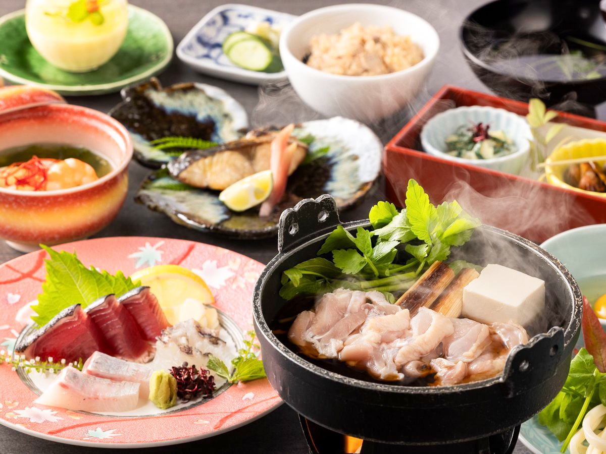 メインの土佐鴨の鴨鍋をはじめ、藁焼き鰹のたたき、たべつづけ鯛松皮造り、龍馬鰤の柚庵焼きなど、高知の冬の味覚をご堪能ください。