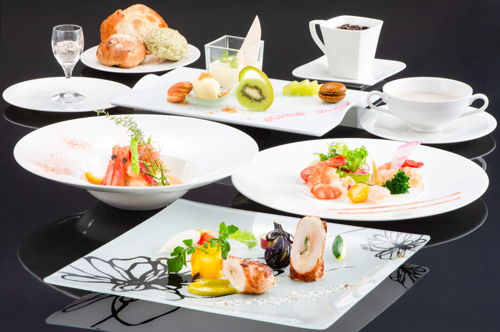 | 夕食 | オードブル、スープ、魚料理、ソルベ、肉料理、デザートまで楽しめるフレンチのフルコース |