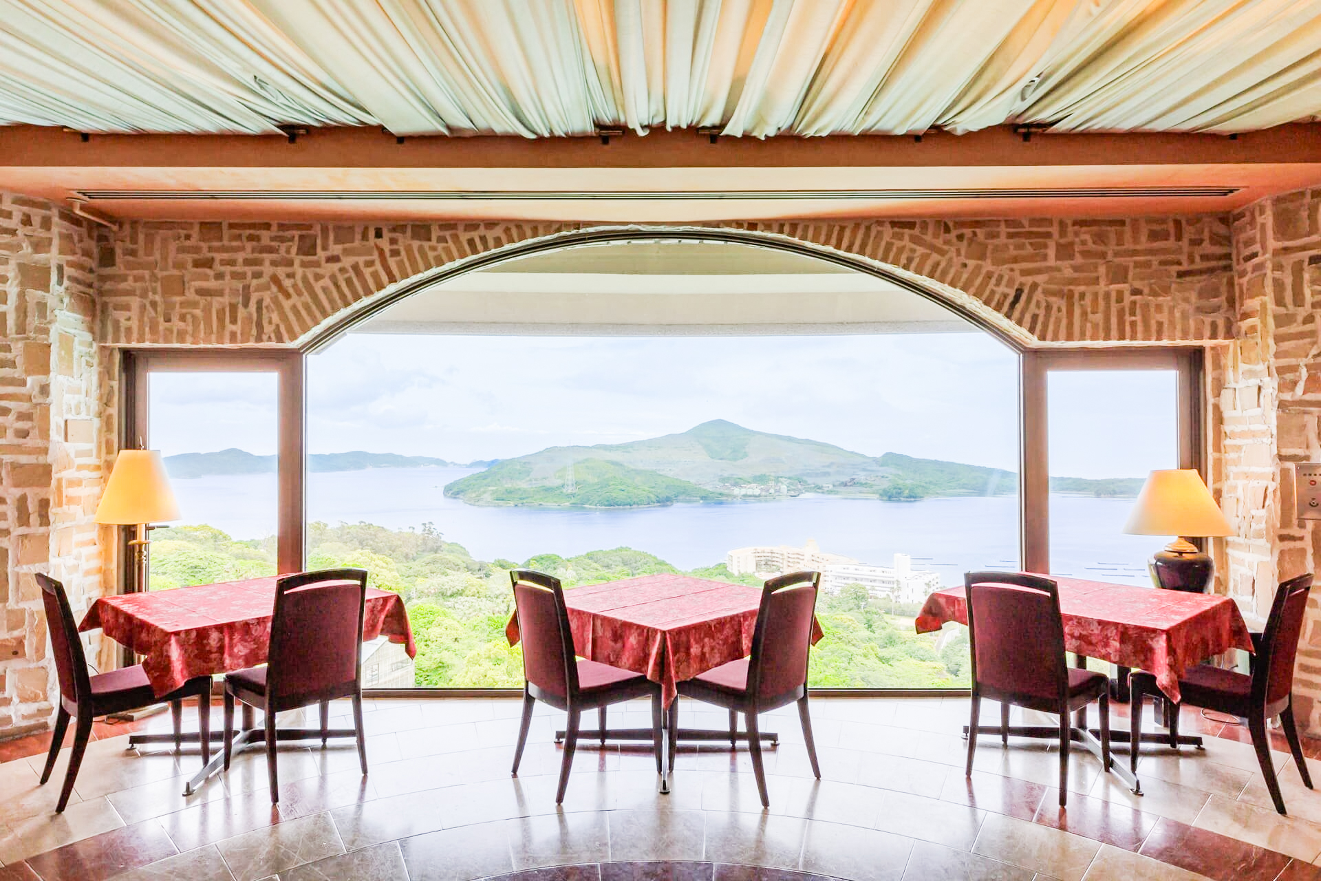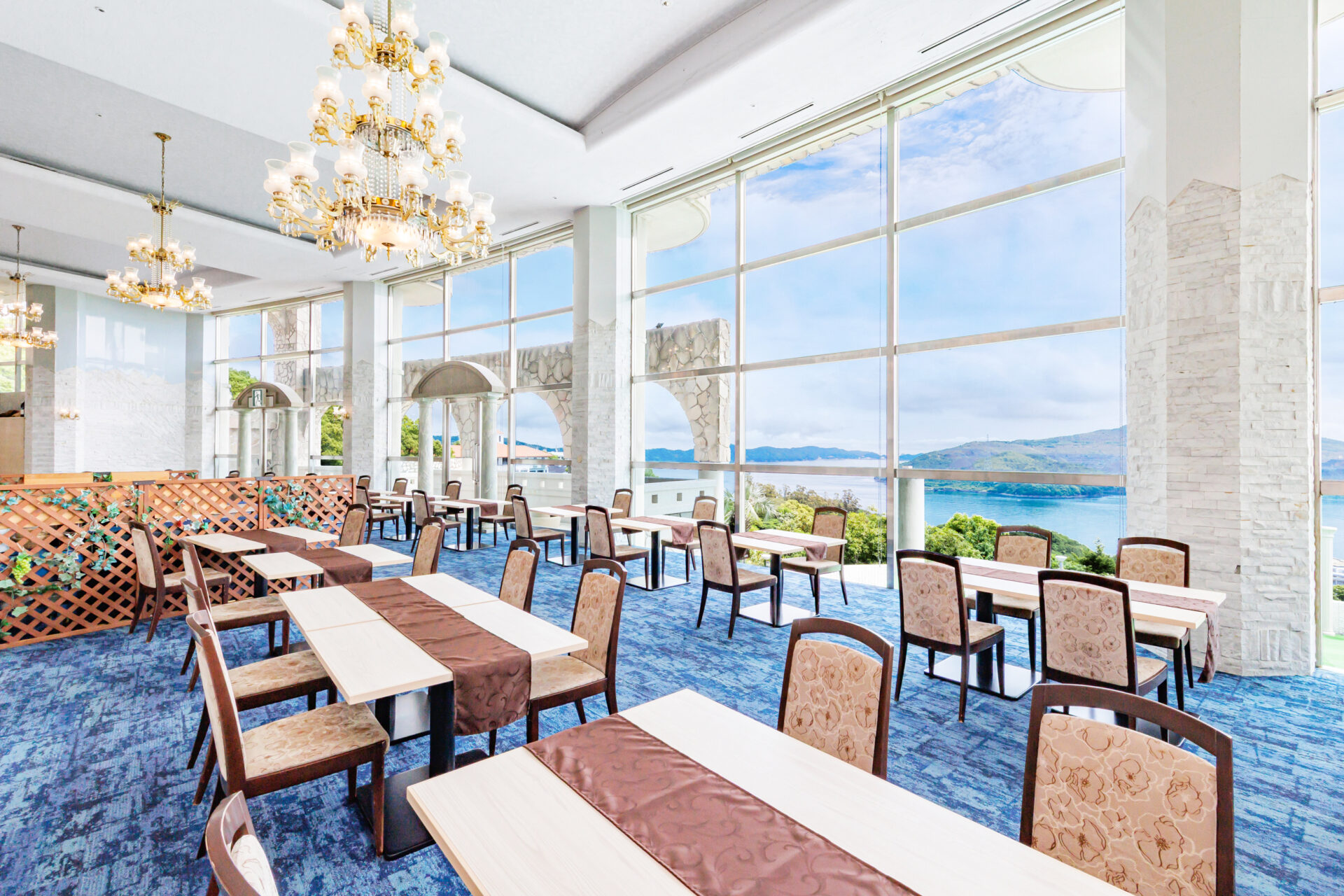 こちらのレストランも、大きな窓から望む空と海の景色が印象的で、ゆったりと食事を楽しめると好評です。