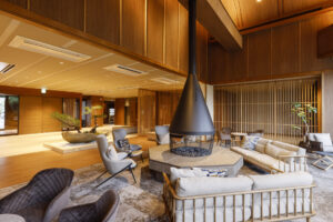 前面ガラス張りの解放感たっぷりのロビーの中央には、なんと暖炉が!