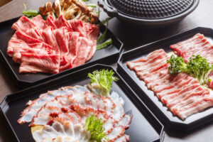 京都姫牛、鳥取大山豚、丹後産水タコ がそれぞれ食べ放題。さっと出汁にくぐらせてお好きなだけお召し上がりください。